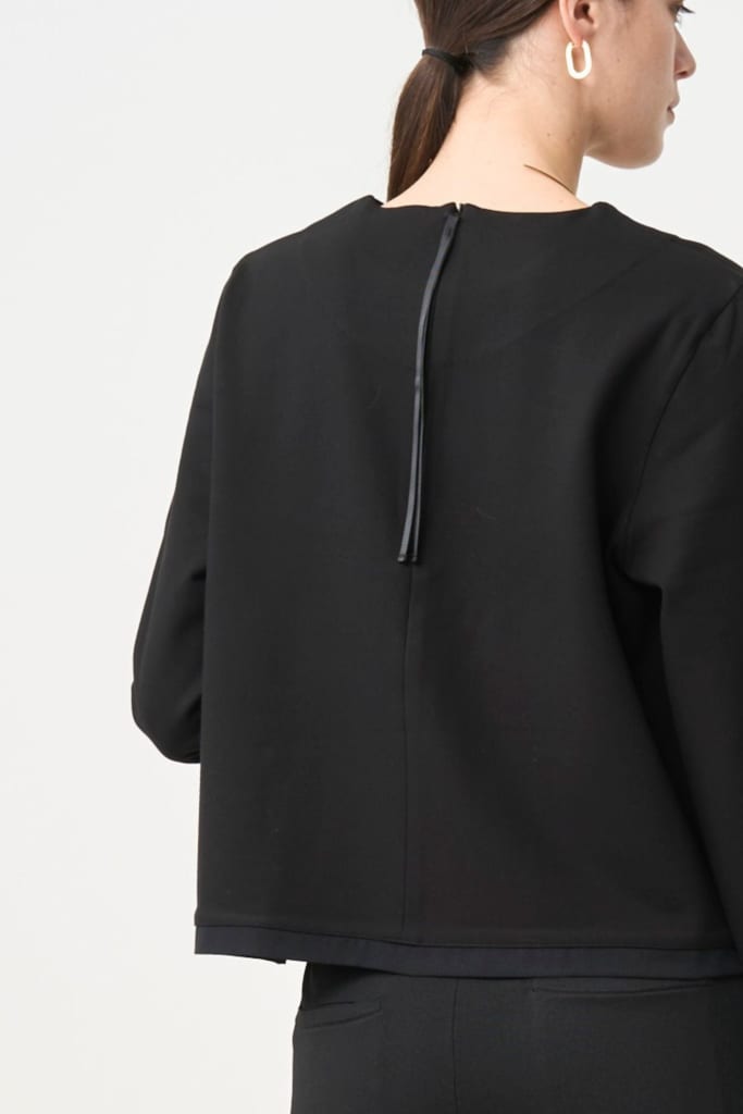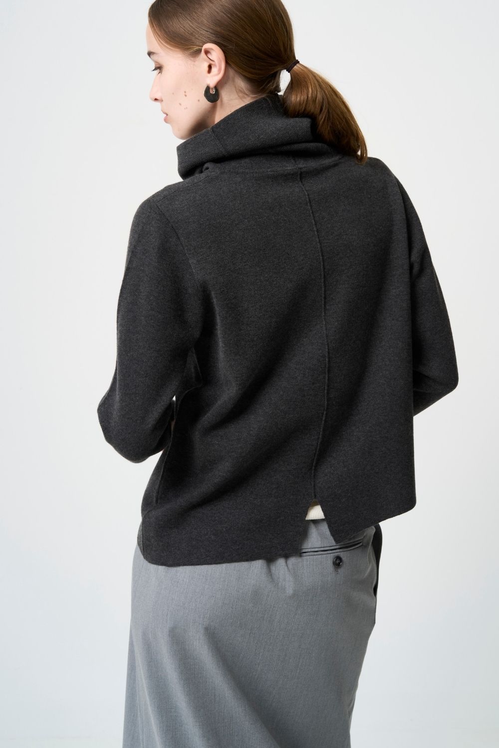 着るだけでしっかりと立ち上がり、首周りを印象付けるネック。形に困ったときは左右どちらかにぐっと寄せて着てみると自然と形が決まります。