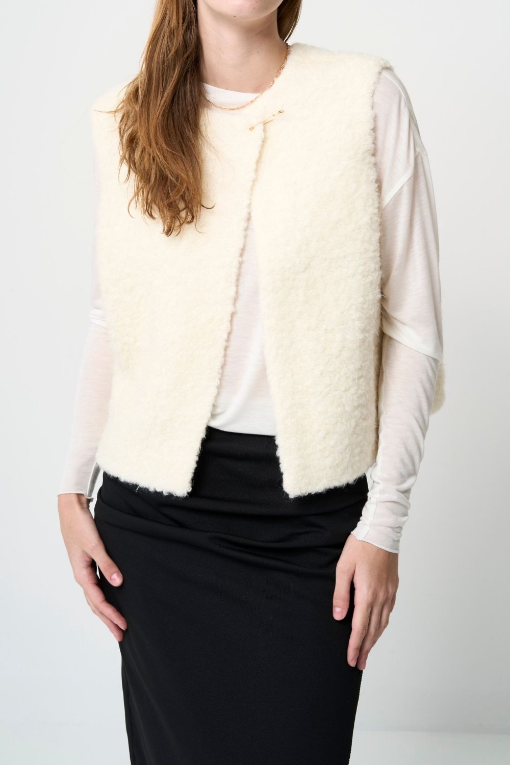 見た目にも暖かく、ふわふわとした質感が季節感をしっかり演出してくれるうえ、厚手のアウターより軽く羽織れるのが最大の魅力です。肩まわりがすっきりするため、重ね着しても着膨れしにくく、冬のレイヤードのバランスを整えやすいアイテムとして注目されています。