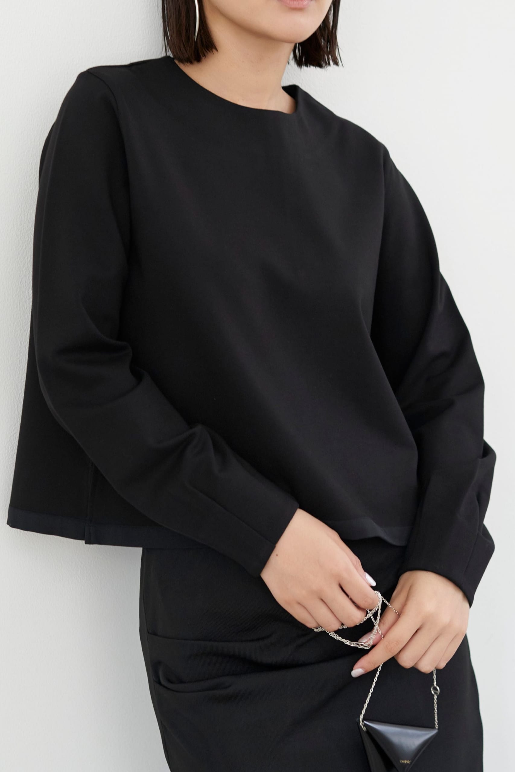 肉厚な生地のため、シルエットがきれいに仕上がるのもアイテムのポイントです。クロップド丈できれいなシルエットにも見え、この冬おすすめしたい1枚。スタイリングをシンプルにまとめても、質感の違いでしっかり着映えするので、“シンプルだけど地味には見せたくない”という方はぜひ試していただきたいアイテムです。