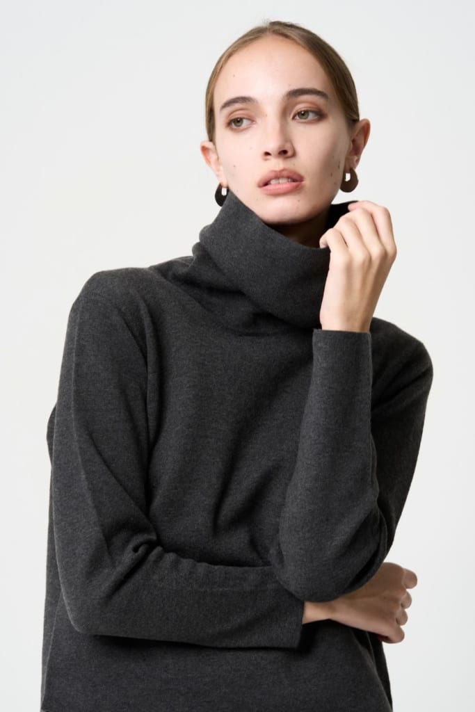 「立体感」が魅力のハイネックトップスは、一般的なタートルネックのように首にピタッと張り付くのではなく、自立するような適度な厚みとハリ感を持たせることで、顔周りにほどよい空間を作ってくれるデザインです。