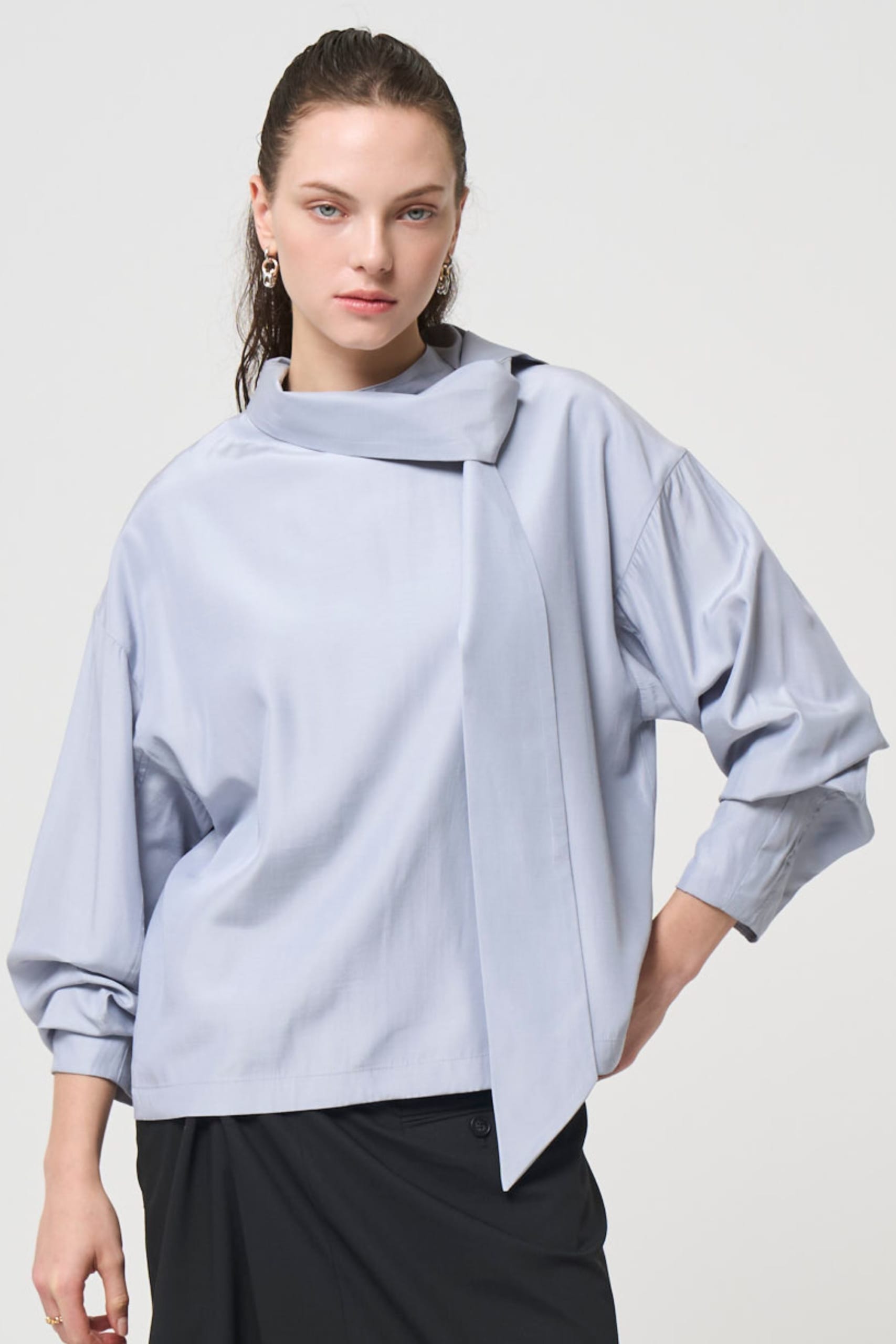 seven dotでも提案している「ボウタイブラウス」のように、一枚で着映えするトップスには、あえて落ち感のあるワイドパンツを。決まりきった型にはまらないセットアップが、大人の余裕を醸し出してくれます。