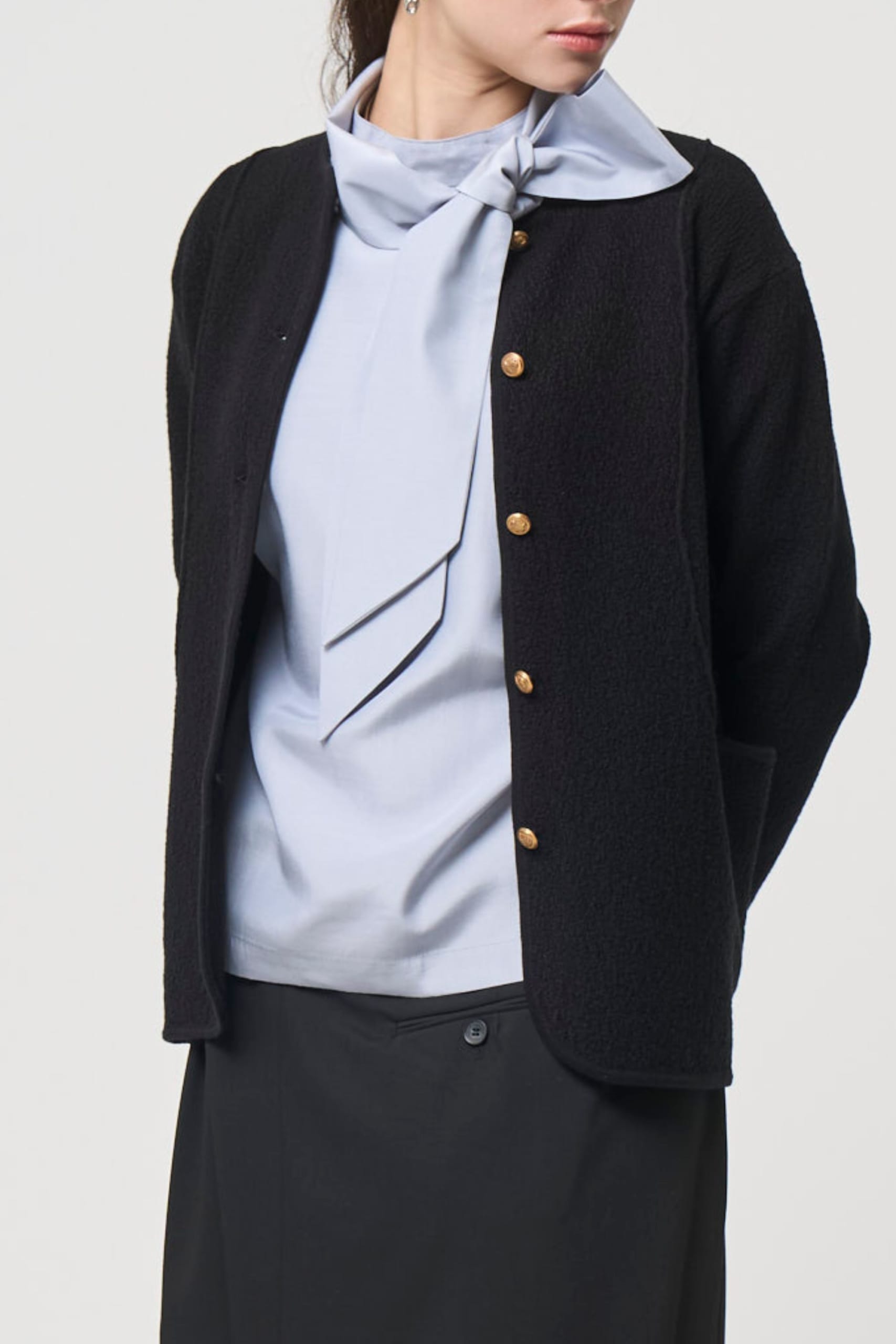 ボウタイは幅・長さともにたっぷりと生地を使用。リボン結びで華やかに、あるいはネクタイ風に垂らしてモードにと、その日の気分や「なりたい自分」に合わせてアレンジが効きます。