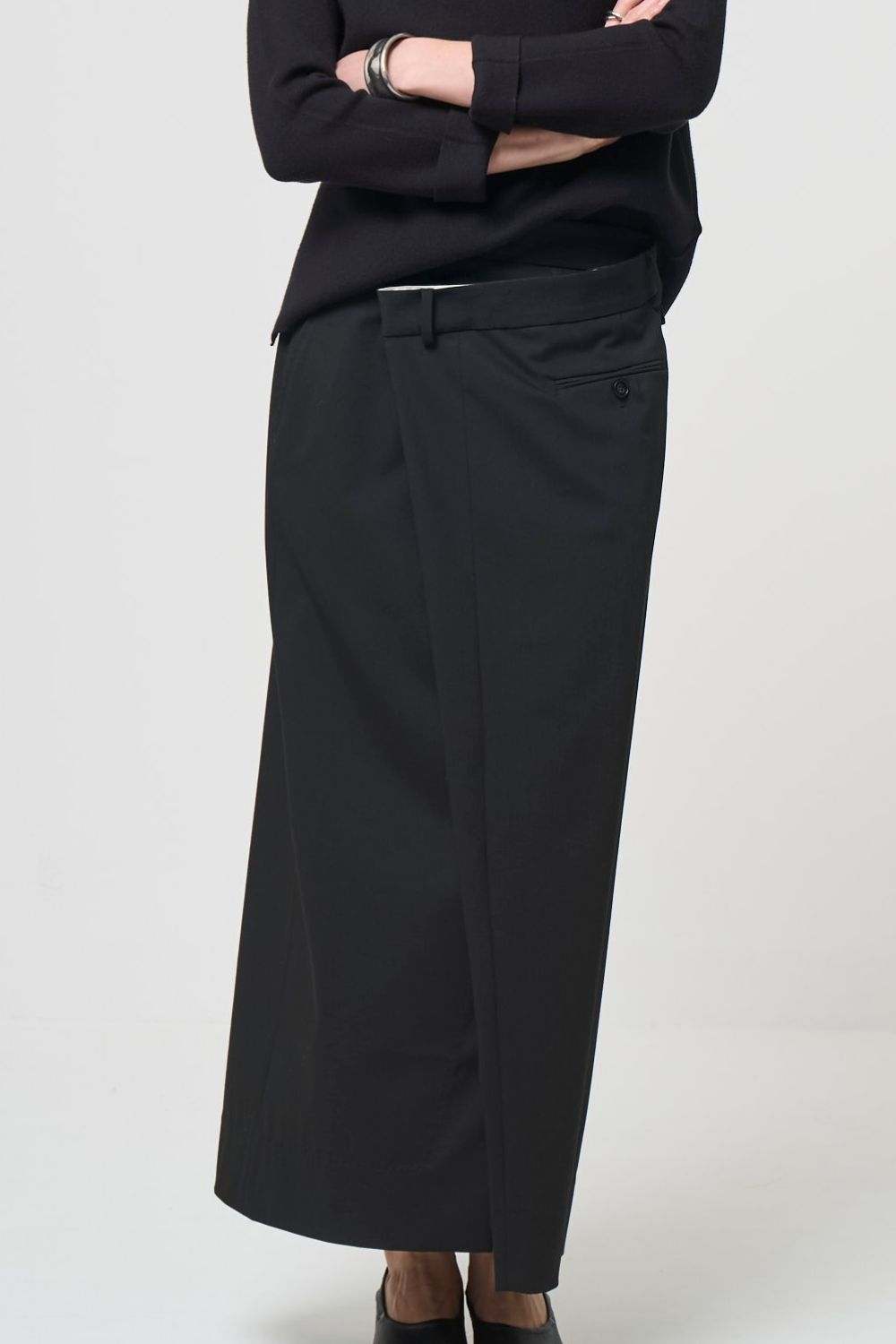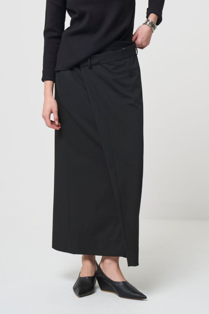 アシンメトリーのラップスカートで、ウエスト部分はあえて裏地が見えるように仕立てているため他にないデザインがおすすめです。